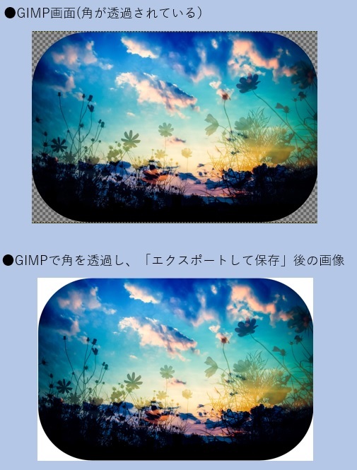 GIMPで画像の角を丸く透過する方法を教えて下さい。GIMPで画像の角を - gimp エクスポート 背景
