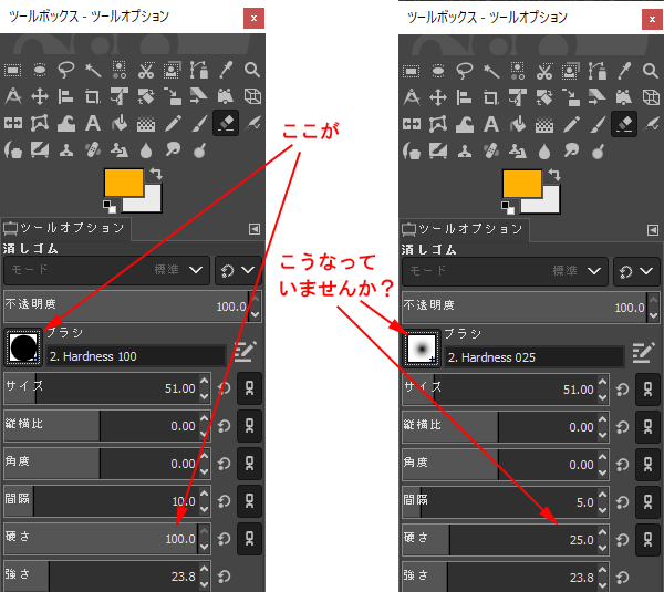 GIMPの消しゴムについてなのですがボカシみたいになってしまってい